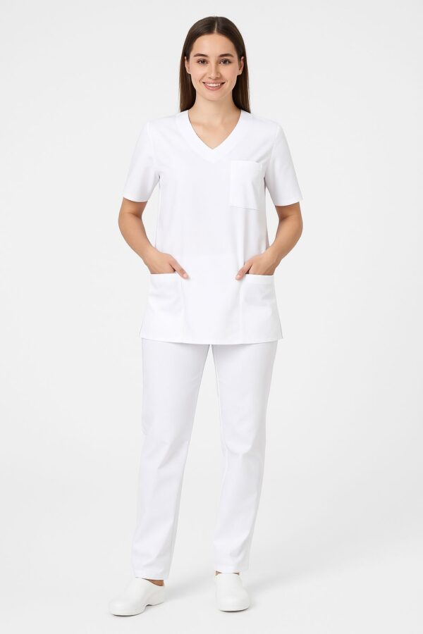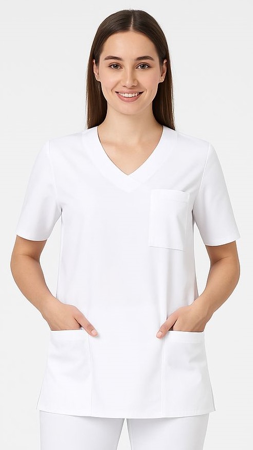 Materiał nie wymaga częstego prasowania, zachowuje kolor i kształt nawet po wielu praniach. To niezawodna odzież medyczna damska, doskonała dla pielęgniarek, lekarek, kosmetyczek i personelu pomocniczego.