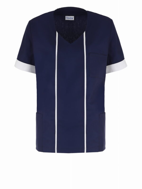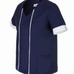 Bluza medyczna damska krótki rękaw, wkładana przez głowę, o lekko taliowanym kroju posiada trzy kieszenie. Dekolt w serek oraz białe wstawki na przodzie i rękawach.