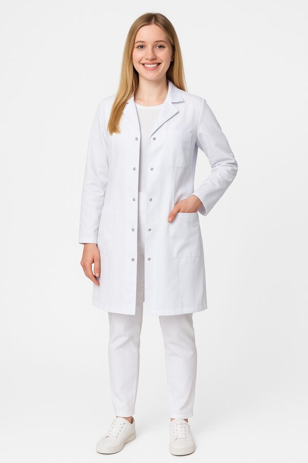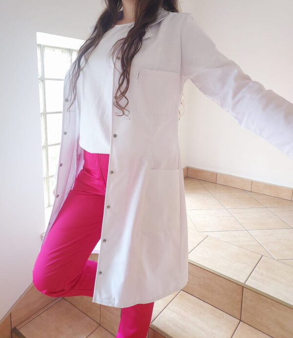 Klasyczny fartuch damski z długim rękawem, posiada trzy kieszenie, dwie kieszenie po boku na wysokości bioder i jedna na piersi. Fartuch medyczny zapinany jest na napy. Miejsca narażone na rozdarcie takie jak kieszenie zostały zaryglowane. Fartuch wykonany jest z mocnej tkaniny odpornej na przetarcia rozdarcia oraz pranie w wysokiej temperaturze.